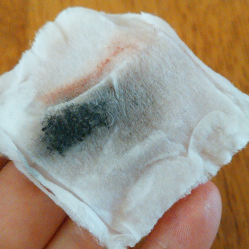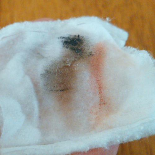 先ほどのコットンをメイクに当てて10~20秒。残ったマスカラと口紅を優しくふき取ると、