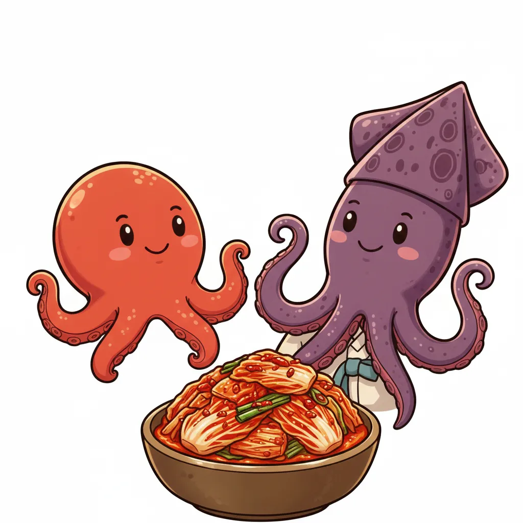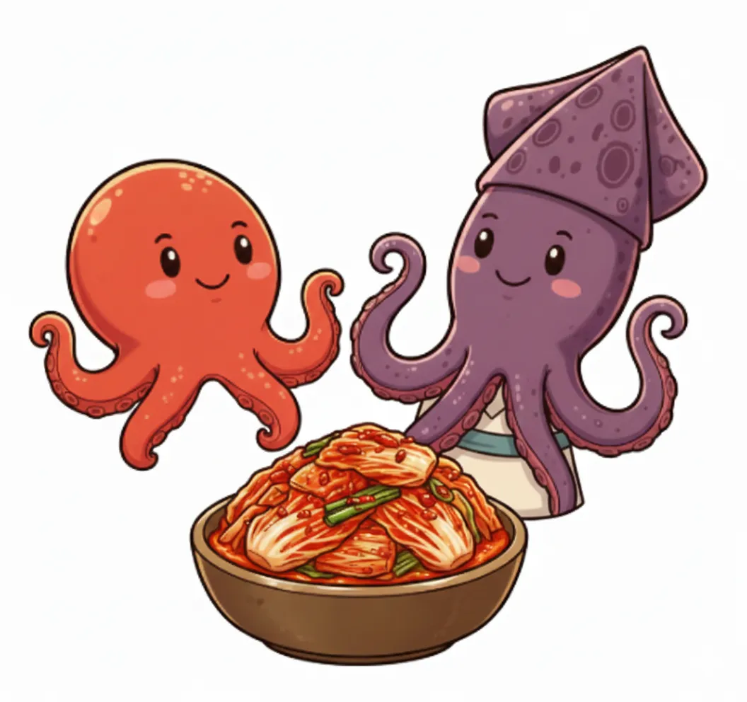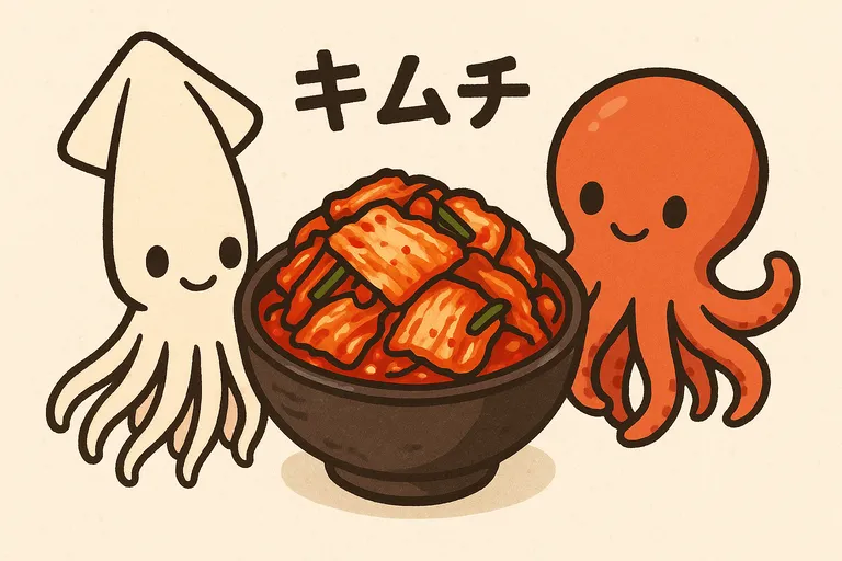 画像の無いブログ記事(韓国キムチ イカキムチ・タコキムチ)にイラストをつけたいと思い、AI「G」さんとAI「C」さんに作成を依頼。「G」さんと「C」さん同時に「イカとタコとその前にキムチ イラスト」とだけシンプルにイラスト作成を依頼しました。